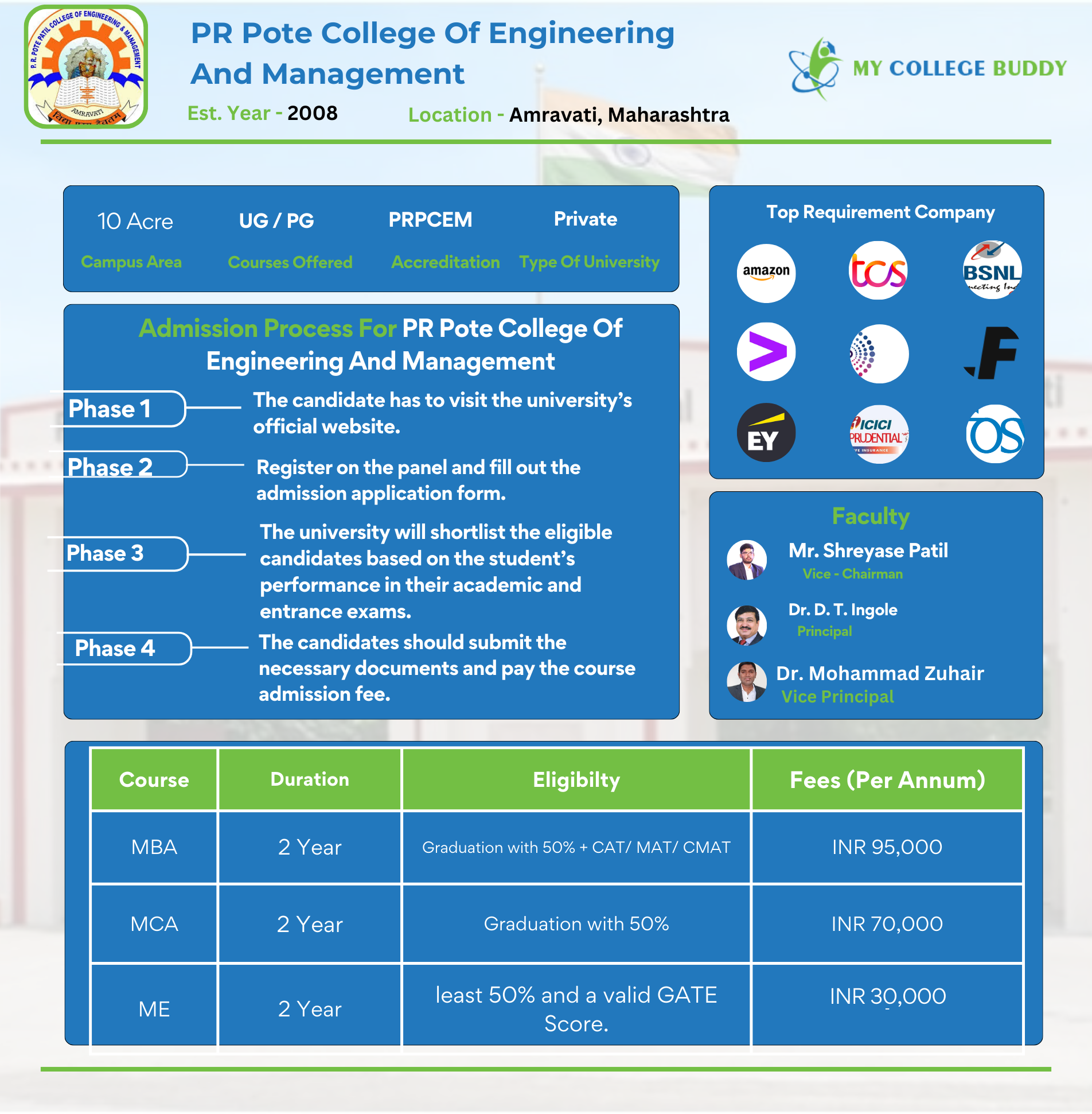 P. R. Pote Patil College of Engineering and Management, Amravati, Maharashtra, or PRPCEM was established in 2008. The institute aims to offer professional education to students in UG and PG degrees in the fields of engineering, management, and computer application. With specializations in multiple fields and subjects, P. R. Pote College of Engineering and Management offers courses at an affordable fee range between INR 70,000 to INR 4,00,000 that deliver students an opportunity to receive knowledge and skills chosen by the student’s choice of program.