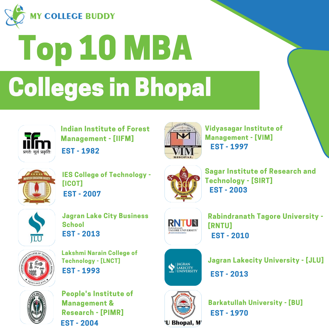 There are around 118 colleges for MBA in Bhopal that include both private and public/government MBA institutes. The best MBA institute is chosen based on multiple factors such as establishment date, courses offered, public or private institute, campus area in acres, fees, placement package, and many more.