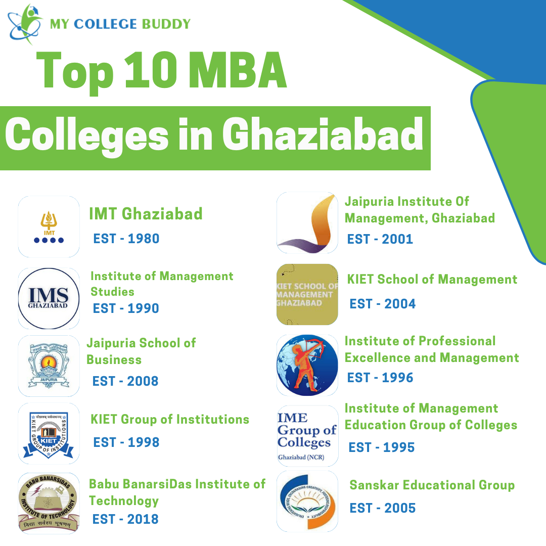 There are several MBA Colleges in Ghaziabad that offer Master of Business Administration as a 2-year regular postgraduate degree program. MBA Colleges in Ghaziabad include a total of around 63 excellent colleges consisting of both government and private institutions. The top 10 MBA Colleges in Ghaziabad List includes institutions with affordable fee structures along with the best facilities and high-quality education provided in the field of management in the city of Ghaziabad. Here are the Top 10 MBA Colleges in Ghaziabad List with other important factors such as type of institution, eligibility, and exams accepted are mentioned below: